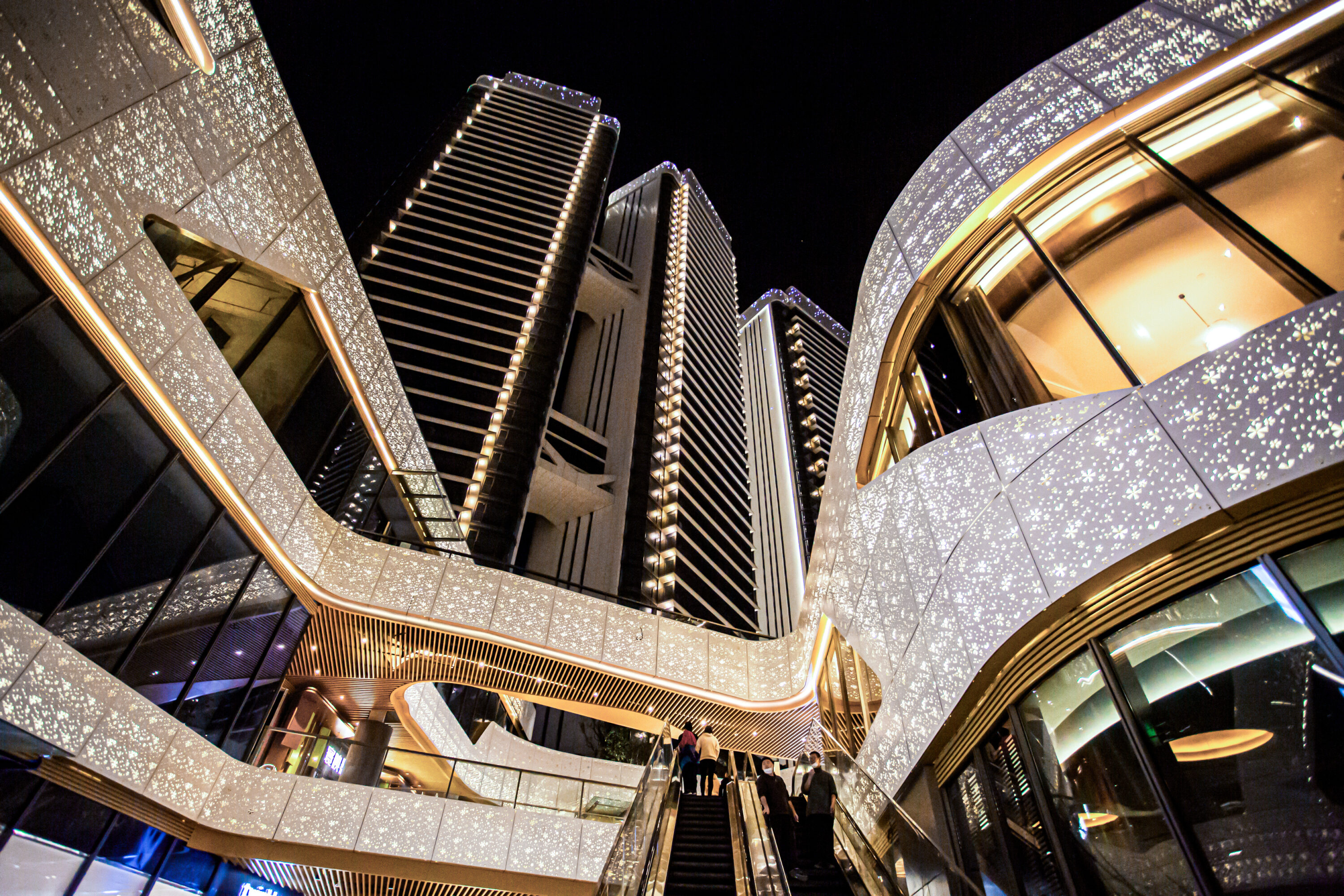 Das Designkonzept basiert auf der Vorstellung von Blütenblättern, die auf den Kieselsteinen am flachen Ufer des Flusses niederfallen (die Fassade ist mit lasergefertigten Blütenblattmustern perforiert). Die wiederkehrenden Wellen des Flusses umspülen sie (zwischen den Etagen der Geschäftsgebäude wurden schräge, bandartige Elemente eingesetzt, die die Fassaden der verschiedenen Gebäudeteile miteinander verweben).