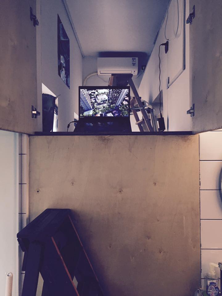 Nachdem wir sie fertiggestellt hatten, schliefen wir in dieser Box. Auf einer Seite befindet sich die Küche, in der wir kochen. Auf der anderen Seite gibt es ein großes Wohnzimmer. Da der Innenraum der Box sehr kompakt ist, konnte das Wohnzimmer maximal vergrößert werden – abends projizieren wir Filme auf die Außenwand der Box.